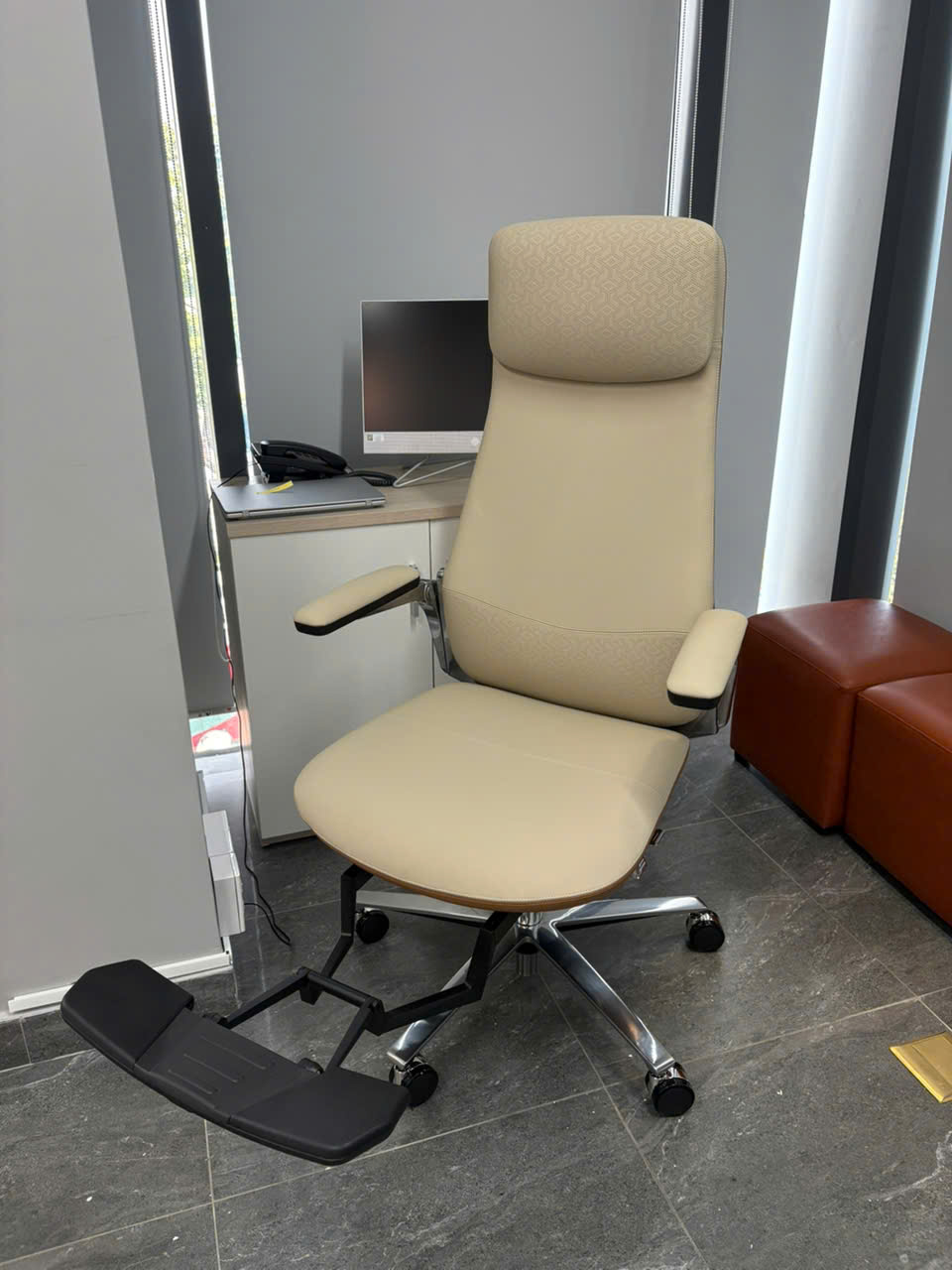 Ghế giám đốc bọc da này mềm hơn so với ghế thông thường, độ vừa vặn cao hơn và diện tích chỗ ngồi lớn hơn. Chỗ để tay và đệm chân khá thân thiện với người dùng, trải nghiệm tổng thể của người dùng rất tuyệt vời!
